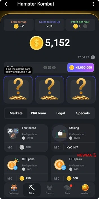 بخش Mine: در این بخش، با خرید کارتهای ویژه از طریق پرداخت توکنهای درون بازی، میتوانید بهصورت خودکار توکن استخراج کنید. این کارتها بهصورت ساعتی برای شما توکن جمعآوری میکنند و میزان توکن دریافتی در بخش Profit per hour نشان داده میشود.