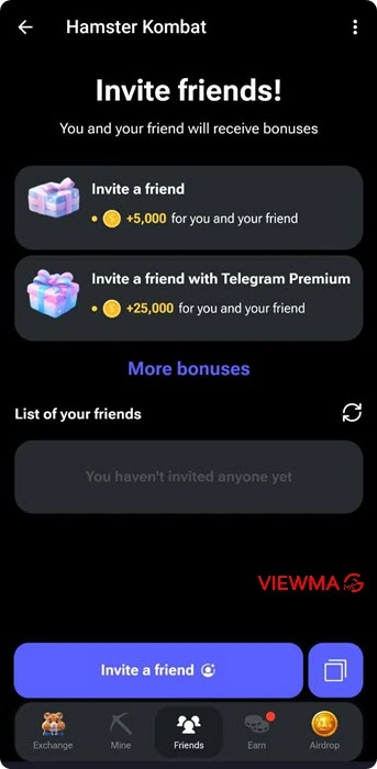 دعوت از دوستان و کسب امتیاز بیشتر: با دعوت دوستان خود به همستر کامبت، میتوانید توکنهای بیشتری کسب کنید. کافی است وارد بخش Friends شوید، کد ریفرال اختصاصی خود را کپی کرده و برای دوستانتان ارسال کنید.